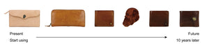 上の見本は使い始めてから10年後の革(ベージュカラー)の変化です。